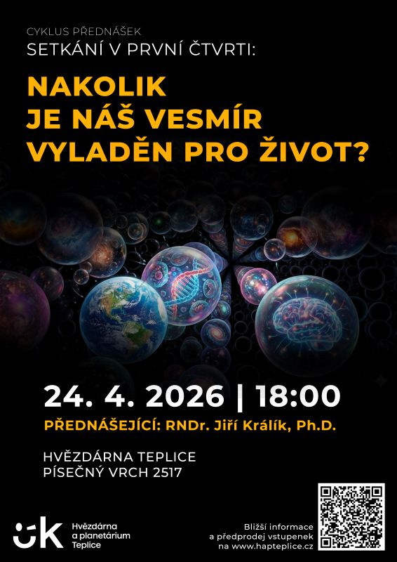 Kdy: Pátek 24. 4. od 18:00 Kde: Hvězdárna Teplice, Písečný vrch Přednášející: RNDr. Jiří Králík, Ph.D. Téma: Nakolik je náš Vesmír vyladěn pro život?
