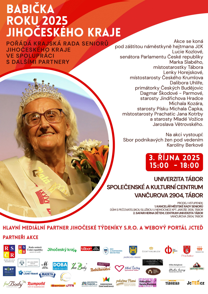 Právě takové ženy chceme představit v soutěži Babička roku 2025, která se letos potřetí koná v Jihočeském kraji, a to v pátek 3. října 2025 od 15:00 ve Společenském sále centra Univerzita v Táboře.