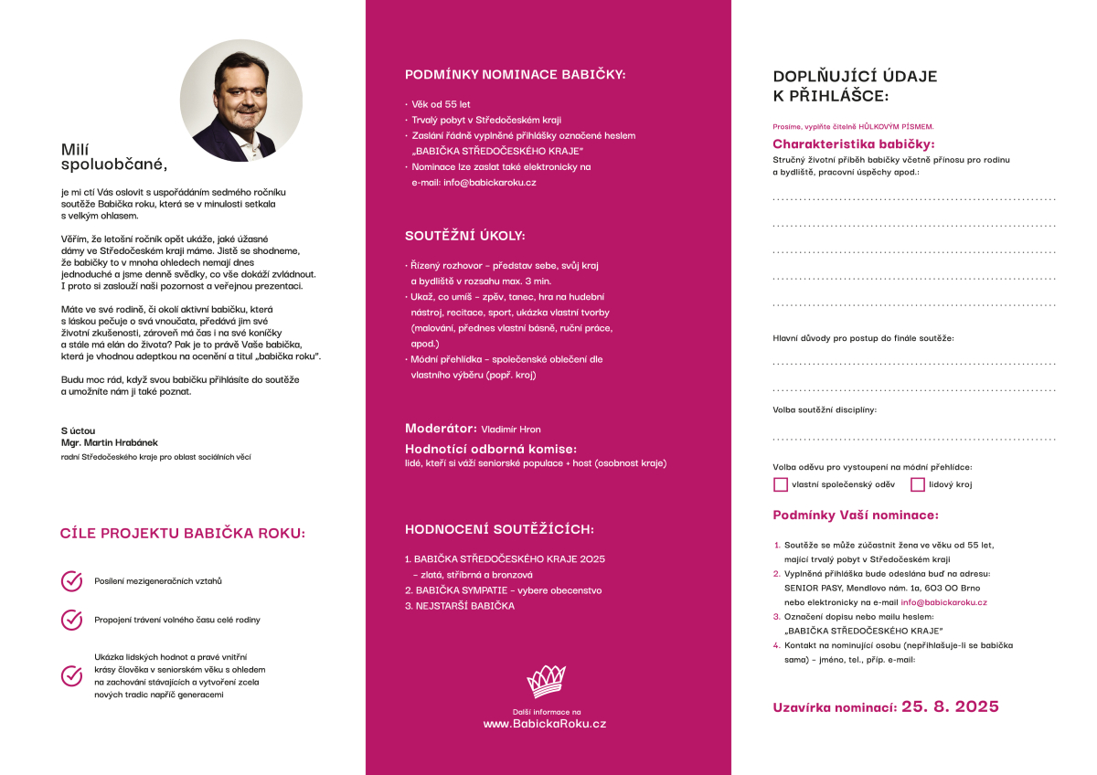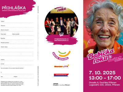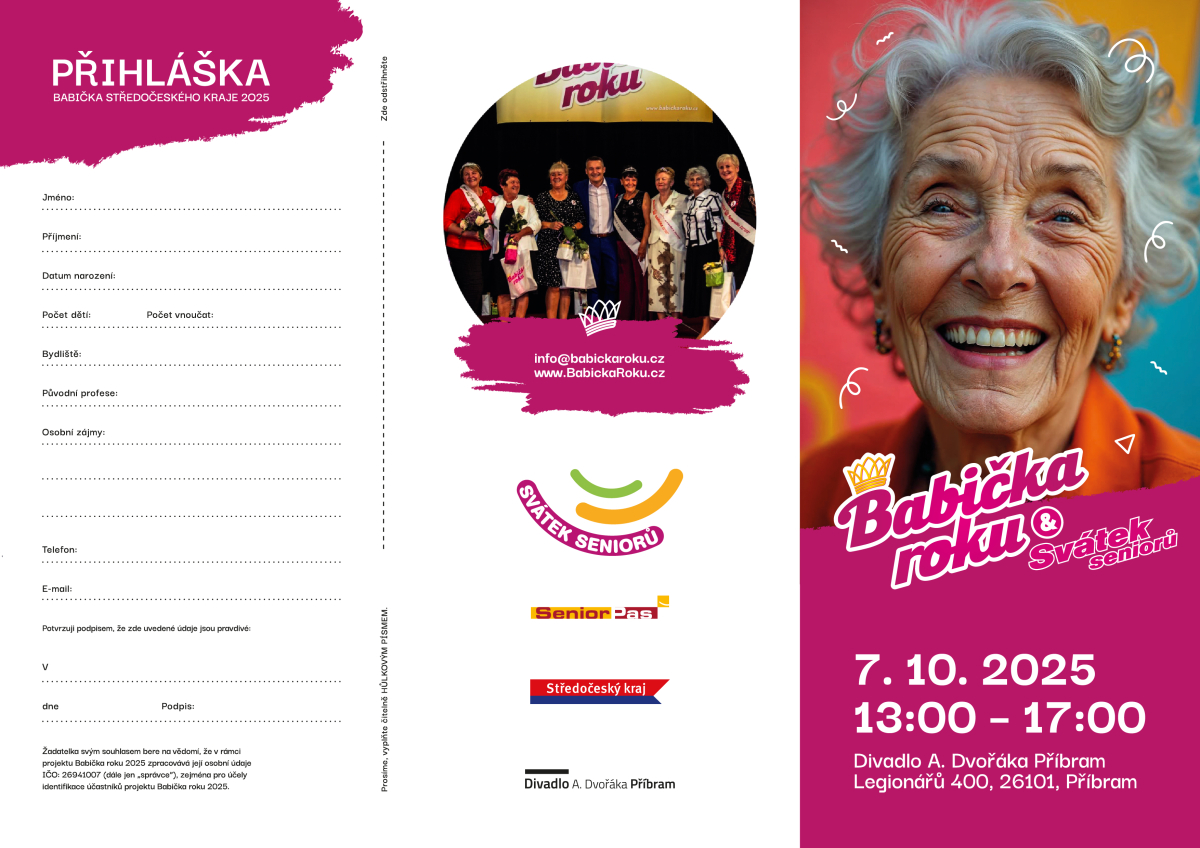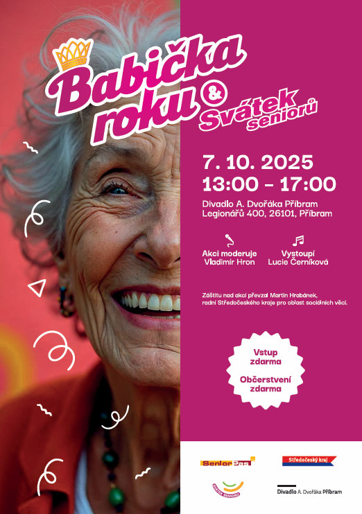 Vyhlašujeme soutěž Babička roku Středočeského kraje 2025, která se uskuteční 7.10.2025 od 13:00 hod. v Divadle A.Dvořáka v Příbrami.