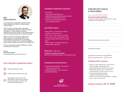 hledáme babičky, které se nestydí a chtějí ukázat, co zajímavého a hezkého dokáží a také dědečky, kteří se nebudou stydět, svoji babičku do soutěže přihlásí a doprovodí ji na soutěž. Přihlásit se můžete přes webové stránky www.babickaroku.cz nebo přes emailovou adresu info@babickaroku.cz .