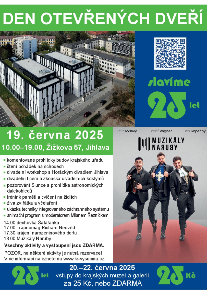 Vážené dámy, vážení pánové, dovolujeme si Vás pozvat na Den otevřených dveří, který se bude konat dne 19. 6. 2025 od 10.00 hodin v sídle Kraje Vysočina.