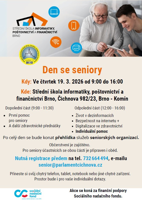 Ve čtvrtek 19. 3. 2026 se bude konat DEN SE SENIORY, který společně připravují studenti ze Střední školy informatiky, poštovnictví a finančnictví Brno a Střední zdravotnické školy Brno, Jaselská.