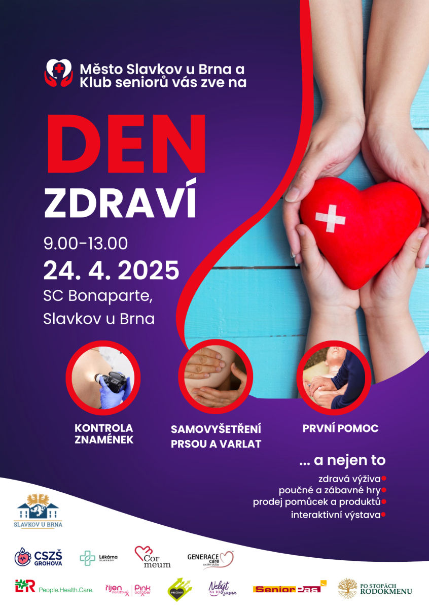 Město Slavkov u Brna a Klub seniorů Vás srdečně zvou na Den zdraví, který se uskuteční ve čtvrtek 24. dubna od 9.00 do 13.00 hodin ve Společenském centru Bonaparte. Toto zdravotně – preventivní dopoledne bude nabité nejen medicínskými tématy. Čeká vás kontrola znamének, základy první pomoci, triky, jak na samovyšetření prsou nebo varlat či nové informace o HPV viru. Těšit se můžete také na virtuální prohlídku historií českých měst díky unikátním 3D brýlím, ochutnávku zdravých svačinek a zajímavé hry zaměřené na informace o zdravé stravě.