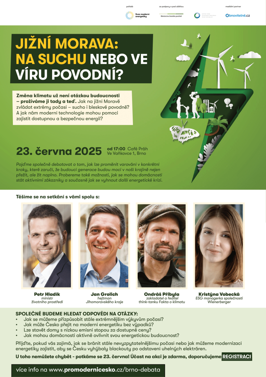 Přijďte, pokud vás zajímá, jak se bránit stále nevyzpytatelnějšímu počasí nebo jak můžeme modernizací energetiky zajistit, aby se Česku vyhýbaly blackouty po odstavení uhelných elektráren.