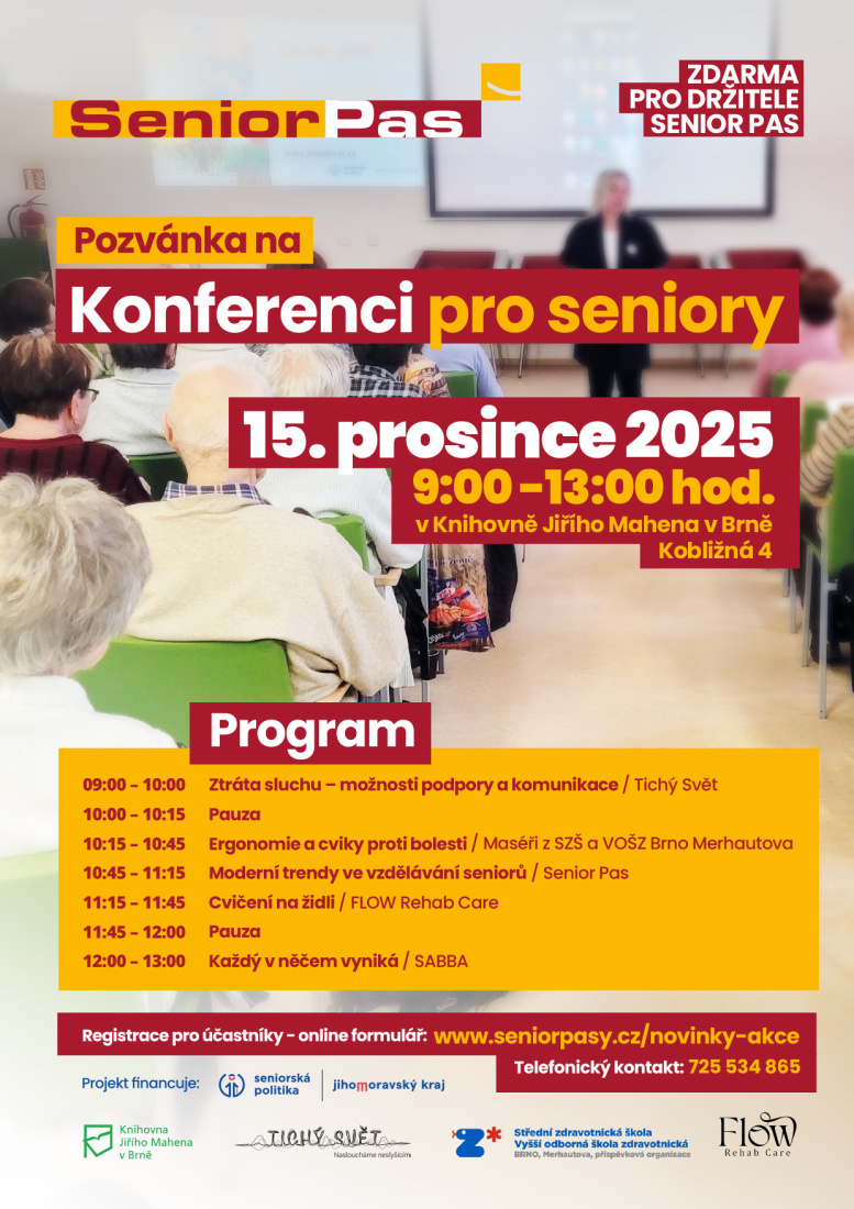 Zveme vás na speciální Konferenci pro seniory, která proběhne 15. 12. 2025 od 9:00 do 13:00 v Knihovně Jiřího Mahena na Kobližné 4.