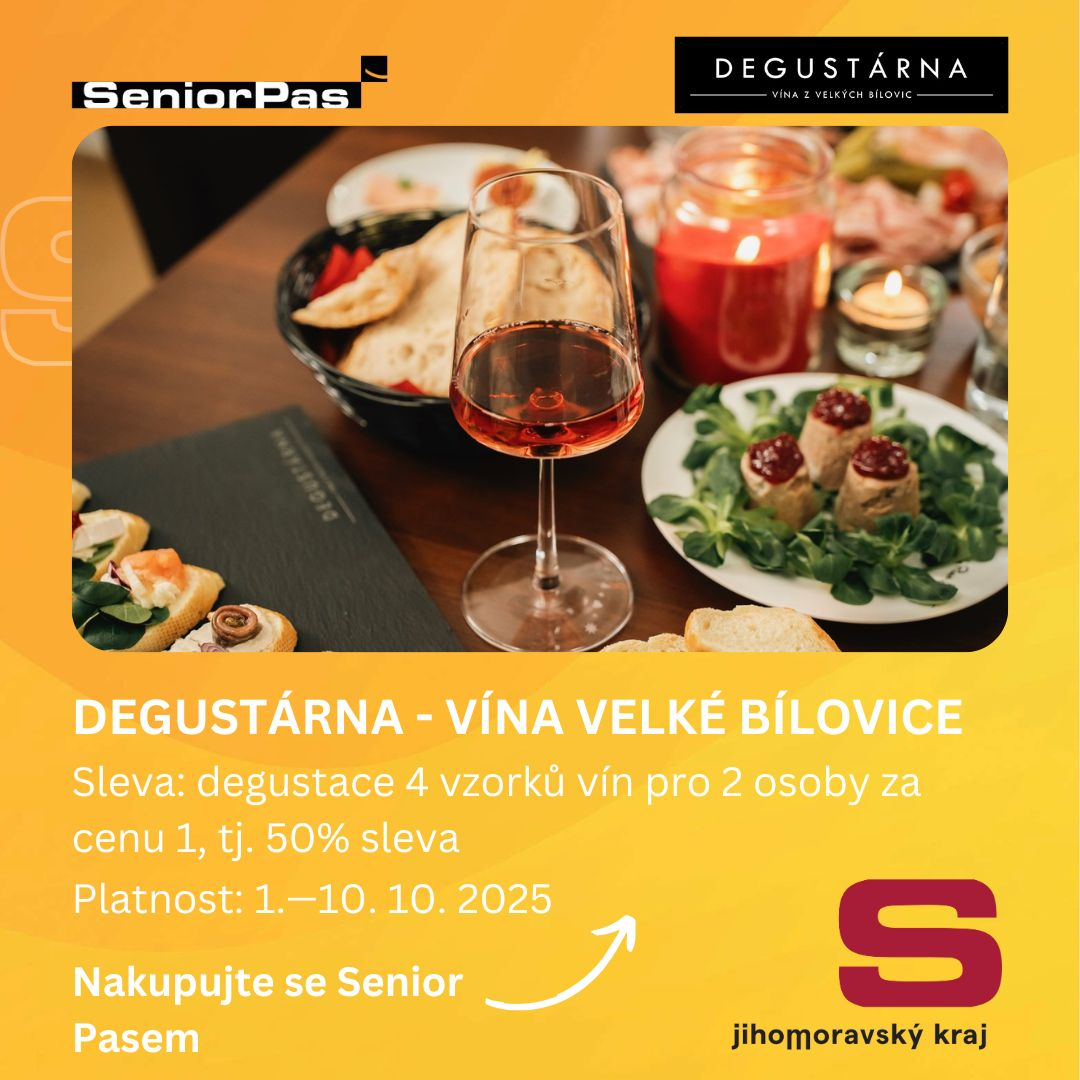 Oslavte Mezinárodní den seniorů s naším dárkem! V termínu od 1. do 10. října 2025 si můžete užít degustaci 4 vín pro dvě osoby za cenu jedné.