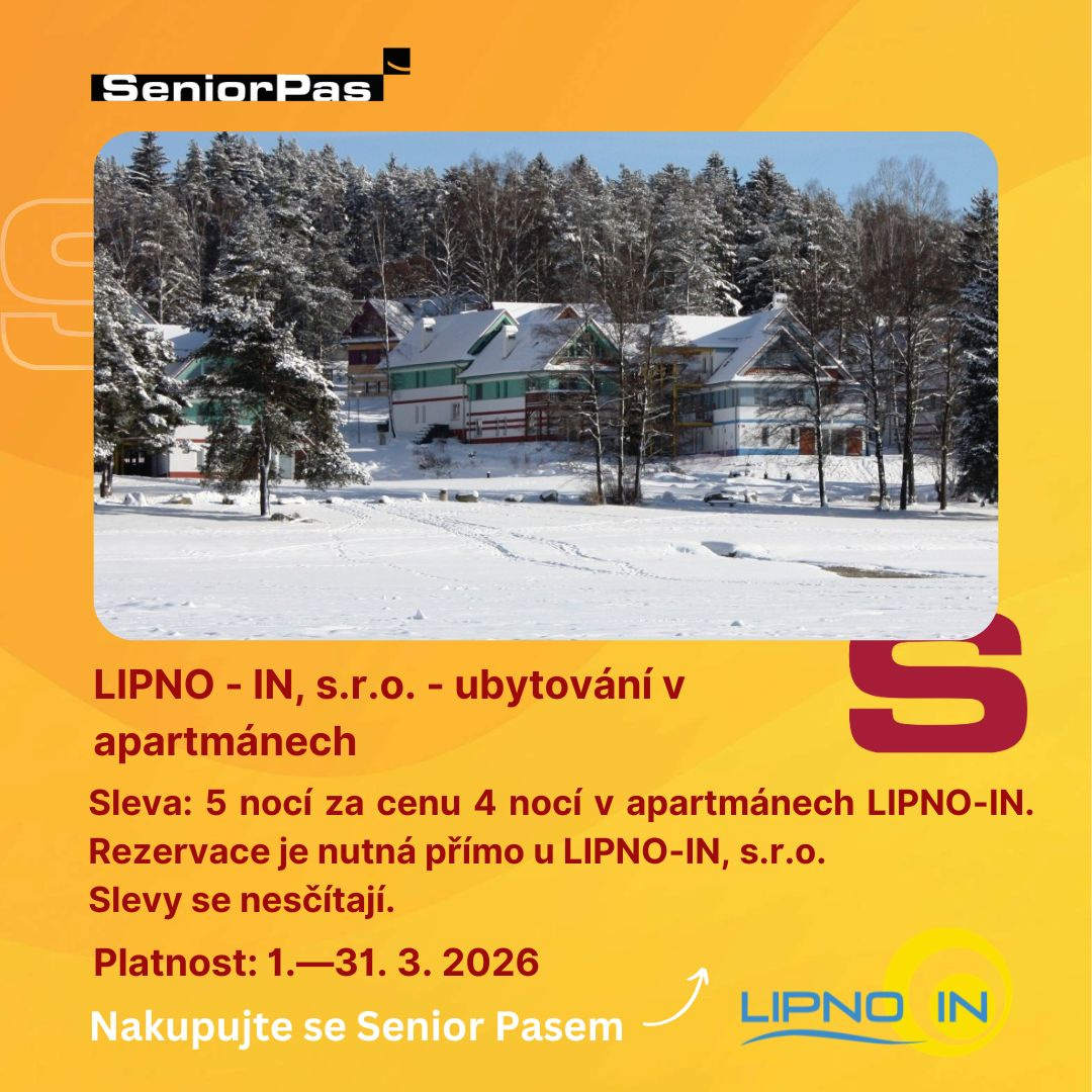 Sleva: 5 nocí za cenu 4 nocí v apartmánech LIPNO-IN. Rezervace je nutná přímo u LIPNO-IN, s.r.o.