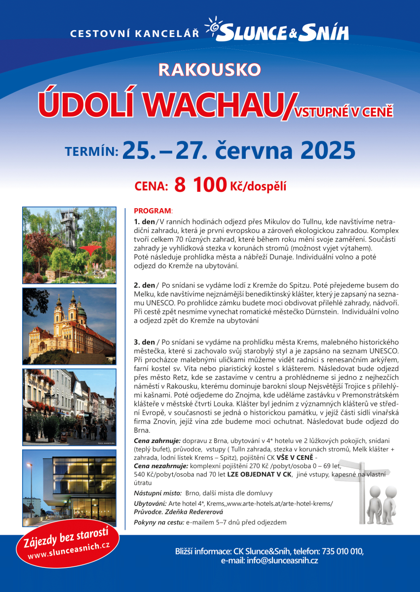 2/ Klikněte na odkaz, poté na Váš vybraný zájezd - tlačítka OVĚŘIT - POPTAT - KONTAKTNÍ ÚDAJE, my Vám obratem zašleme smlouvu a podklady k platbě.