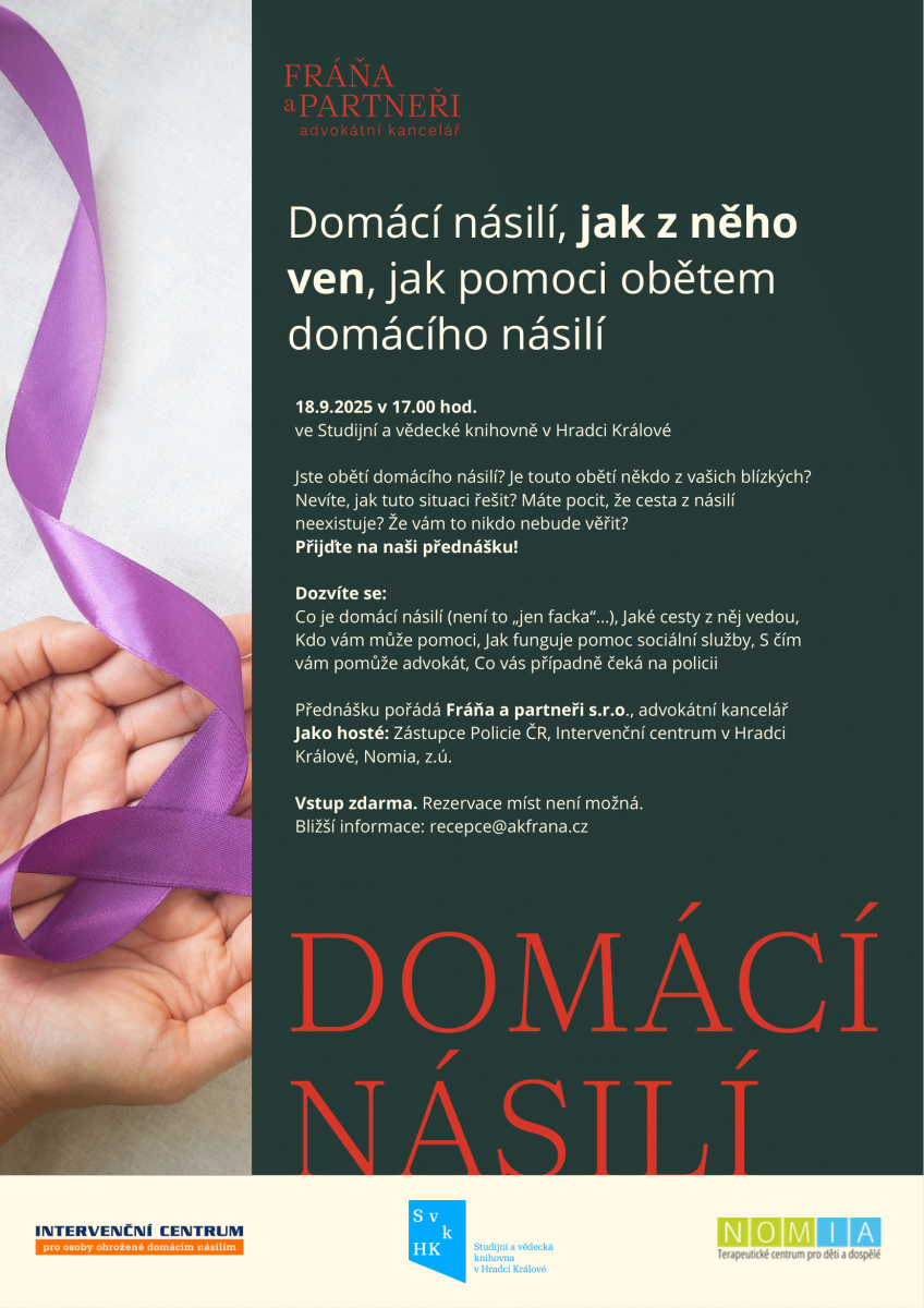 Srdečně vás zveme na přednášku „Domácí násilí, jak z něho ven, jak pomoci obětem domácího násilí“ pořádané advokátní kanceláří v součinnosti s Policií ČR, organizací Nomia z.ú. a Intervenčním centrem Hradec Králové.