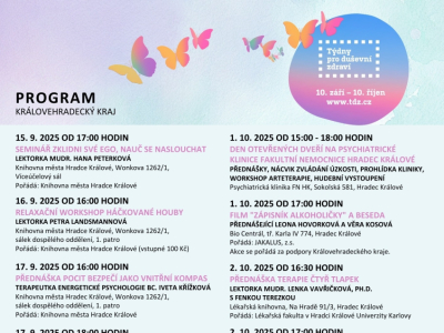 Zajímají vás témata duševního zdraví? Chcete se v této oblasti vzdělávat či se dozvědět něco nového? Pak si zapište do diářů termín 10. 9. – 10.10. 2025, kdy můžete navštívit celou řadu zajímavých akcí v rámci Týdnů pro duševní zdraví. Besedy, přednášky, výstavy, divadlo, filmové projekce a další rozmanité aktivity jsou připraveny v rámci celé ČR. Nahlédněte na program na Týdny duševního zdraví - Týdny pro duševní zdraví a podpořte svou účastí myšlenku již 36. ročníku této osvětové kampaně. Program pro Královéhradecký kraj je k dispozici zde: Program 2025 - Týdny pro duševní zdraví