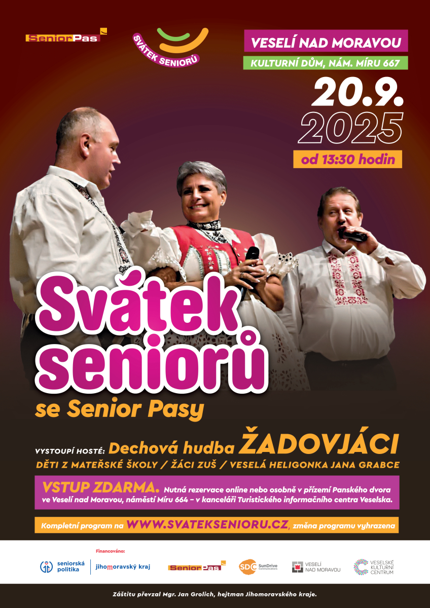 srdečně vás zveme na oslavu Svátku seniorů, který se uskuteční 20. září 2025 v Kulturním domě ve Veselí nad Moravou, nám. Míru 667.