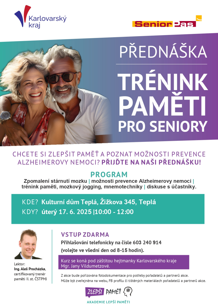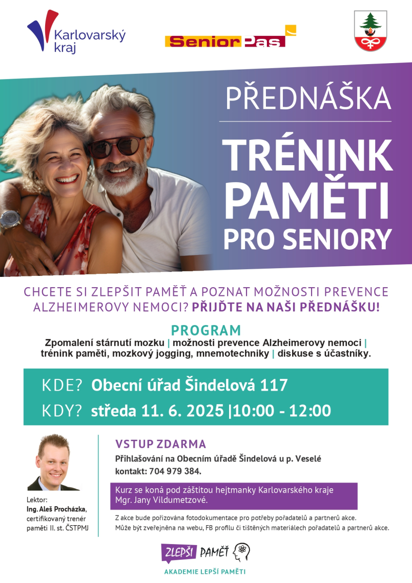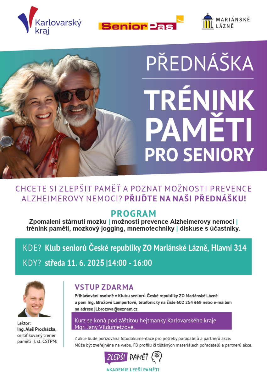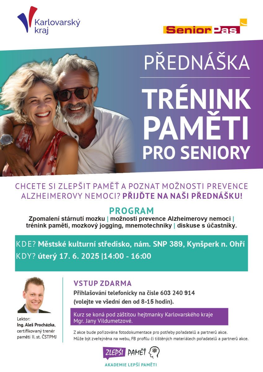 Kurzy trénování paměti pro seniory v rámci Senior pasu 2025. Přednášky na téma boje proti zapomínání, zpomalení stárnutí mozku, zlepšení paměti, prevence Alzheimerovy nemoci, efektivní učení ve vyšším věku, rozvoj kreativity apod., včetně seznámení účastníků kurzu s technikami na zlepšení paměti a procvičení odpřednášených technik, zodpovídání dotazů účastníků. Lektorem bude akreditovaný trenér paměti - Ing. Aleš Procházka.