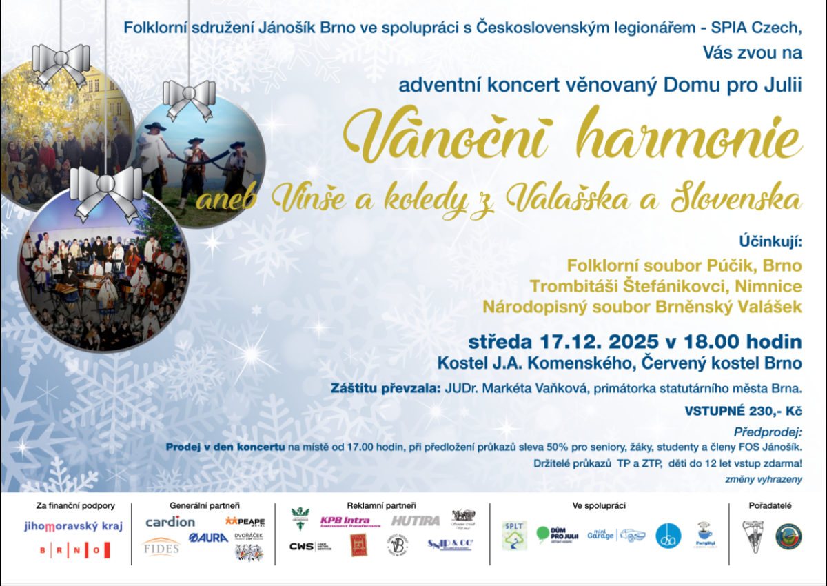který se uskuteční ve středu 17. 12. 2025 v 18.00 hodinv Červeném kostele (kostel J. A. Komenského) v Brně. Letošní pořad se ponese v duchu vánočních koled a tradičních lidových písní s názvem „Vánoční harmonie aneb Vinše a koledy z Valašska a Slovenska“ nad kterým převzala záštitu primátorka statutárního města Brna, JUDr. Markéta Vaňková.