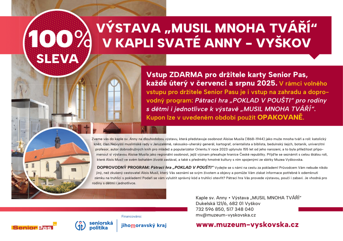Vstup ZDARMA pro držitele karty Senior Pas, každé úterý v červenci a srpnu 2025.V rámci volného vstupu pro držitele Senior Pasu je i vstup na zahradu a dopro vodný program: Pátrací hra „POKLAD V POUŠTI“ pro rodiny s dětmi i jednotlivce k výstavě „MUSIL MNOHA TVÁŘÍ“. Kupon lze v uvedeném období použít OPAKOVANĚ.