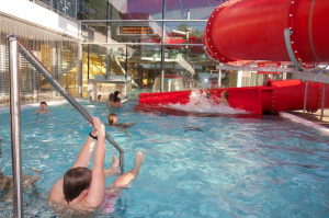 Vnitřní areál, umístěný na dvou podlažích, nabízí návštěvníkům jak možnost si zaplavat, tak i řadu nepostradatelných atrakcí a zábavy pro celou rodinu. Pro milovníky plavání i kondiční plavce jsou připraveny 4 dráhy ve 25 m plaveckém bazénu, pro děti je určen školní bazén s unikátním posuvným dnem, vyřádit se můžete na tobogánu nebo v rekreačním zážitkovém bazénu. V ceně vstupného do aquaparku je parní a vířivá lázeň. K dispozici jsou i další služby.